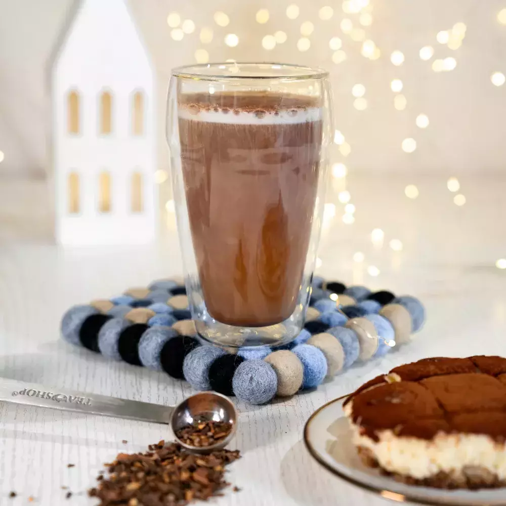 Té Rojo Pu Erh de fermentación especial, raíz de achicoria, cáscara de cacao, CEBADA, Té Negro, Rooibos, cacao en polvo, chocolate blanco, granos de café y aromas.